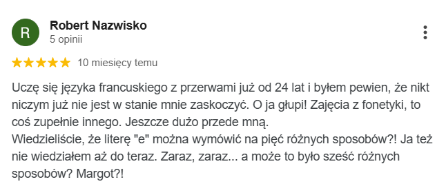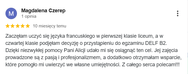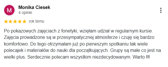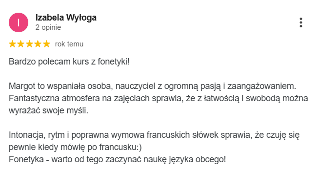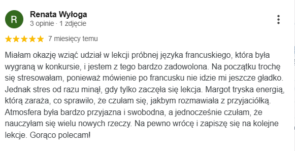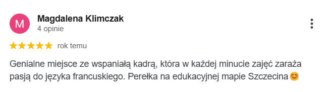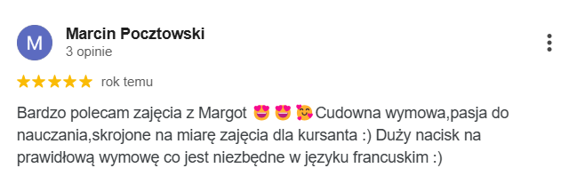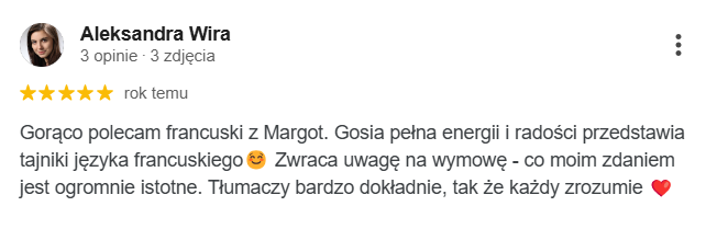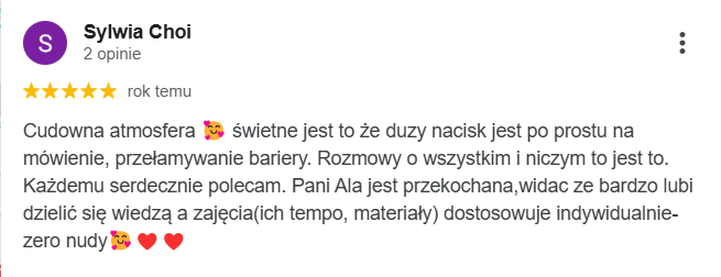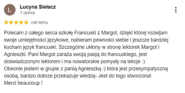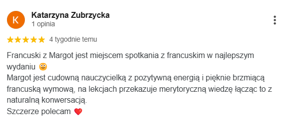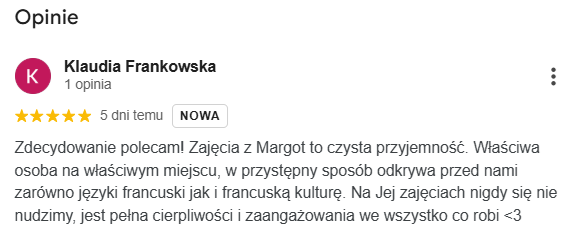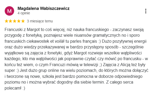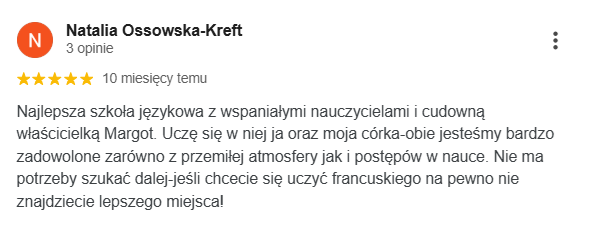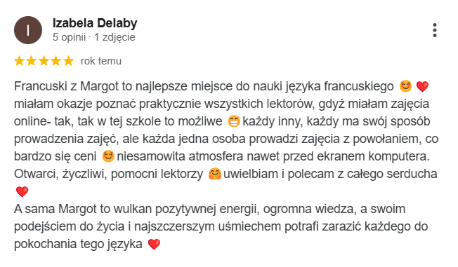 Najlepsza szkoła językowa ze wspaniałymi nauczycielami i cudowną właścicielką Margot. Uczę się w niej ja oraz moja córka. Obie jesteśmy zadowolone z zarówno z przemiłej atmosfery jak i postępów w nauce.